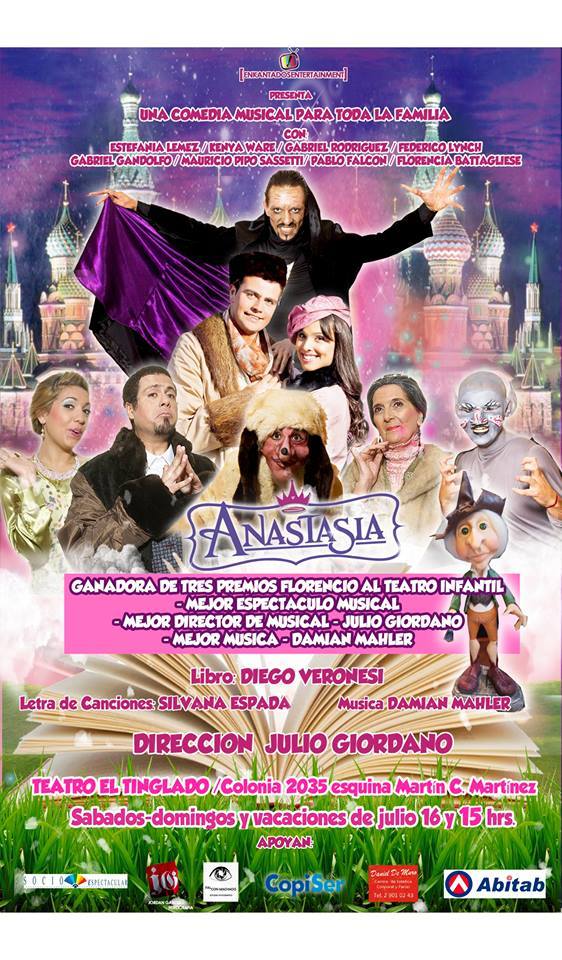 - ANASTASIA: Teatro el Tinglado, Género: Musical (Espectáculo premiado con tres premios Florencio por Mejor Musical, Mejor ambientación sonora y Mejor dirección)